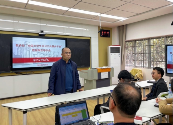 2月28日下午,教务处在S1-221智慧教室组织召开了“全国大学生实习公共服务平台”数据报送培训会。各相关学院教学副院长、分管毕业实习工作教学秘书、专业负责人、教务处实践科工作人员参加了会议,会议由教务处处长张晓宇主持。
