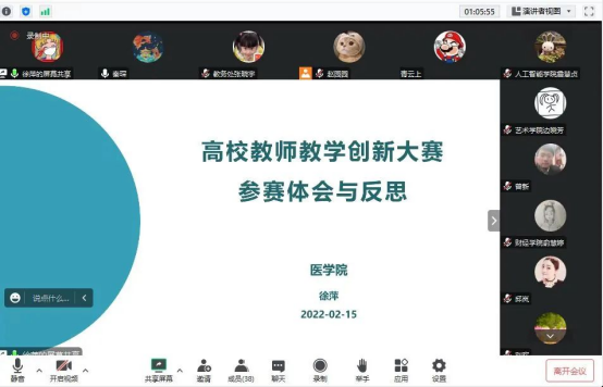 此次会议邀请了医学院徐萍、教育学院黄可老师来分享比赛经验,交流参赛心得。徐萍老师结合所授课程提出“发现教学痛点、创新教学手段、解决难点问题”的整体思路,分享了创新方式方法、营造活跃课堂的经验以及个人参赛感悟;黄可老师结合自身参赛经验,介绍了教学大纲、创新成果报告的撰写要点,教学视频录制的建议、现场汇报的准备工作等。