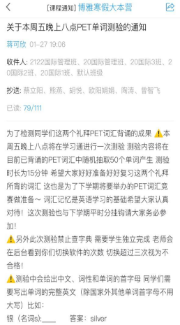 为了响应学校“寒假停课不停学”的号召,进一步督促学生弯道超车,帮助学生巩固课堂知识与提升自主学习能力,博雅国际学院寒假期间在超星学习通线上平台开设“博雅寒假大本营”课程,给学生布置寒假作业打卡和PET级别词汇背诵的任务,并在寒假期间全程指导学生完成雅思阅读、雅思听力、雅思口语和雅思写作打卡作业,并为学生答疑解惑,每周进行一次词汇线上测试。