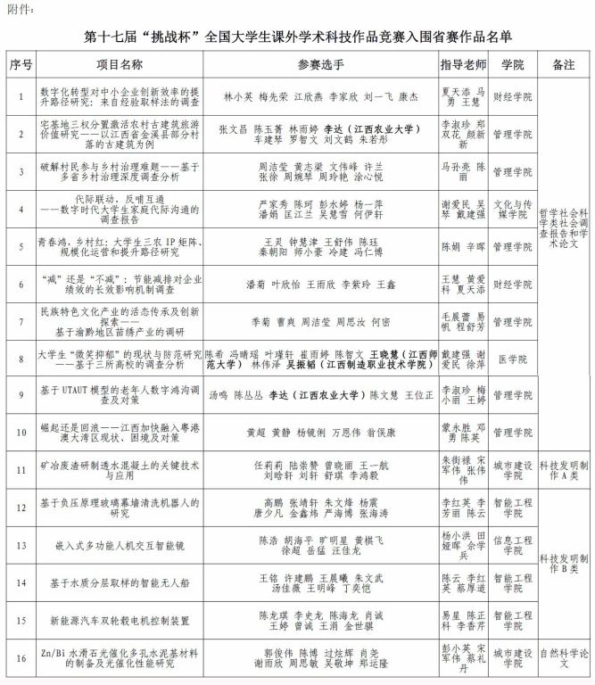 根据《关于举办第十七届“挑战杯”全国大学生课外学术科技作品竞赛365英国上市公司官网选拔赛的预通知》(江科双创办发〔2020〕61号)文件精神。我校积极组织开展校级选拔赛,经过校级初审、复审、专家盲审、终审、路演、强化训练等环节,最终评选出16项优秀作品入围省赛,作品名单详见附件。另我校管理学院学生胡婷婷(学号201999026886)作为南昌大学参赛作品《“沉默规则”打破者:青年群体性别平等观念的进步与未竟--基于江西省九所高校的调研报告》团队成员参赛,现特此公示,公示时间4月10日-4月15日,如有异议请与双创办联系。联系人:董行行,电话88136181。