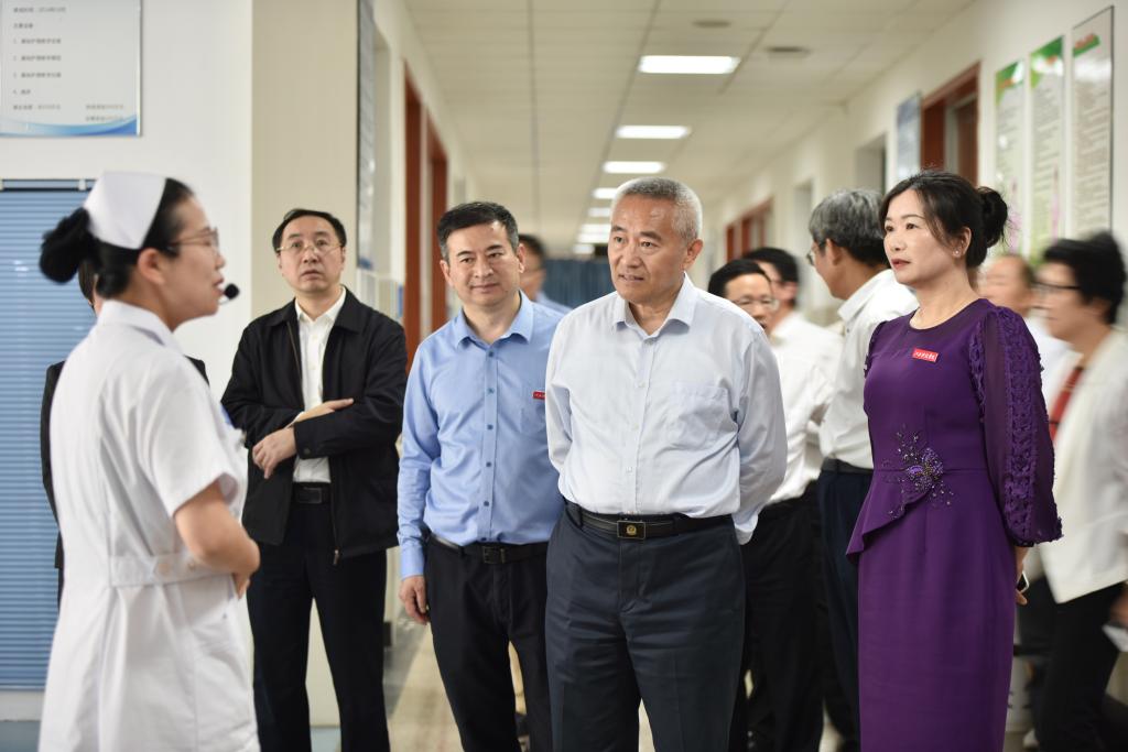 图为:全国政协副主席邵鸿在医学院听取护理实训中心的介绍。