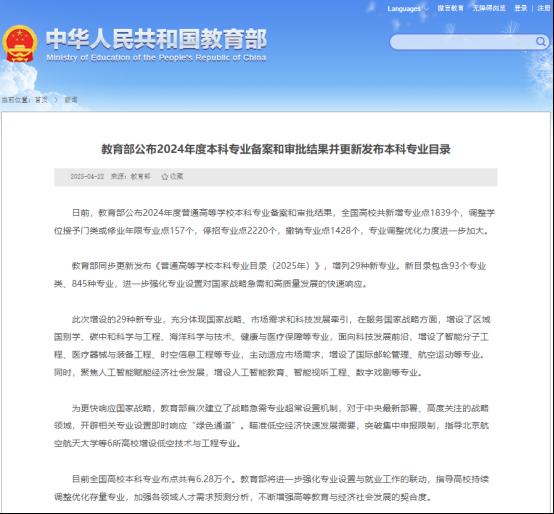 近日,教育部公布了2024年度普通高等学校本科专业备案和审批结果,学校申报的“数字人文”“智能科学与技术”“电子与计算机工程”3个本科专业顺利获批教育部新增专业备案。