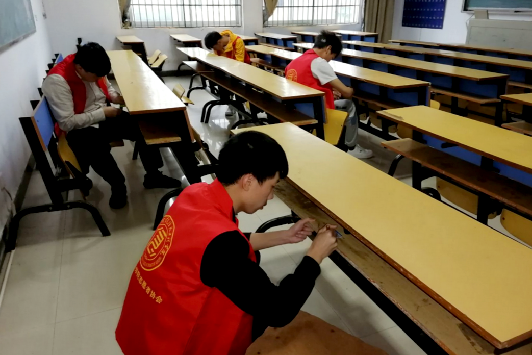 信息工程学院学生党员代表联合志愿服务中心志愿者在学院展开一场清理“牛皮藓”的志愿服务活动。同学们分为两组,一组提着垃圾袋,戴着手套清理学院周围路面及花坛草坪内的垃圾杂物;一组带着剃刀,尺子等工具走进各个教室,对墙面和桌面的“牛皮藓”广告进行清理。大家以实际行动为全院师生创造一个干净、整洁、美好的学习、工作环境。